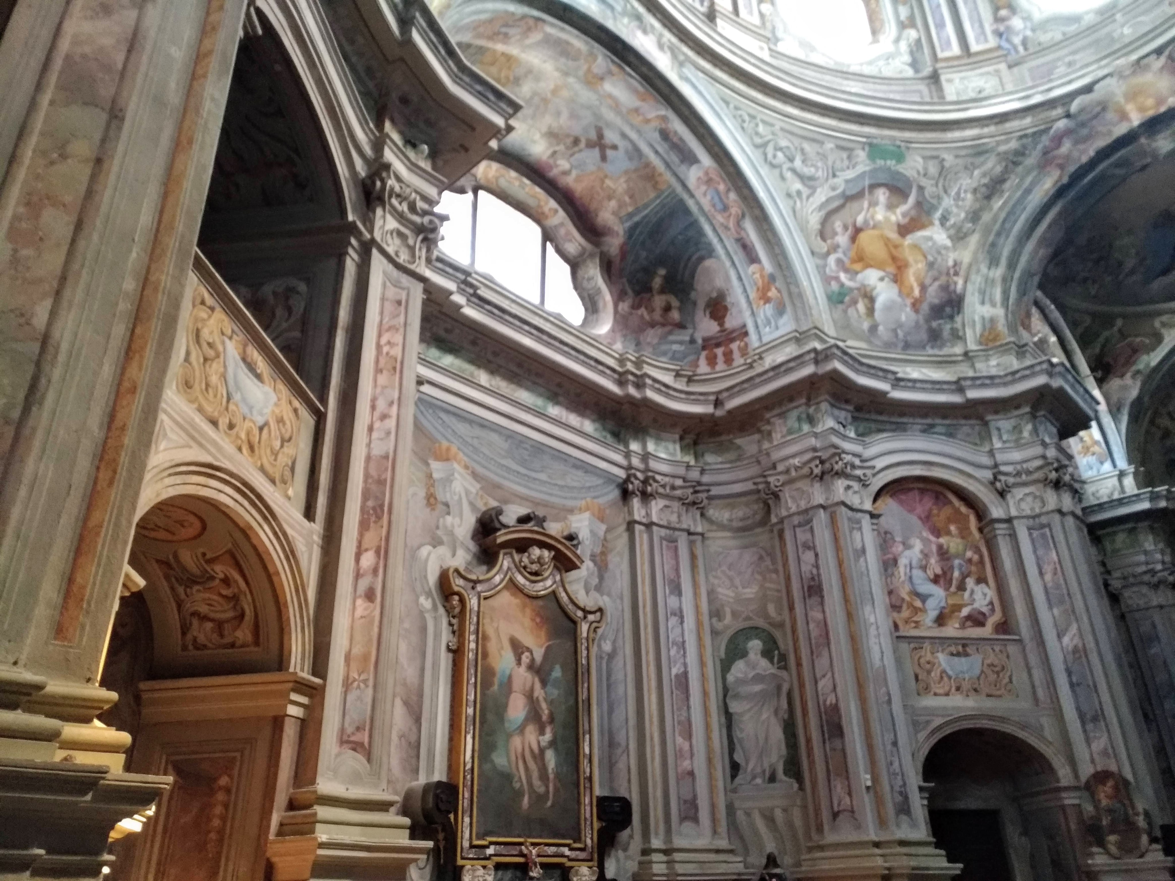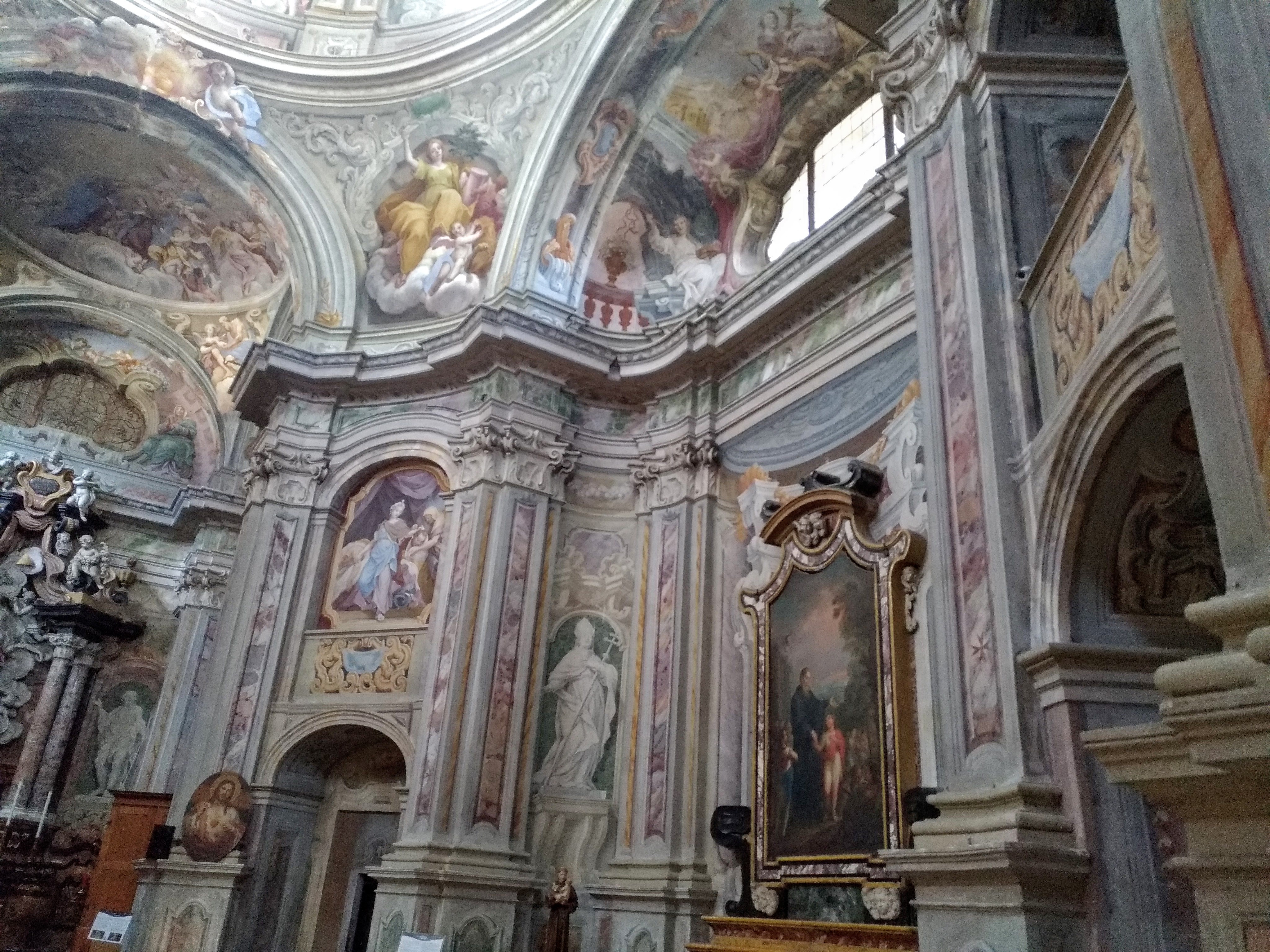Prima di andarcene ci siamo affacciati nella Chiesa di Santa Caterina, chiesa che si trova un po’ nascosta in un angolino di Piazza Castello. Ma appena entrati rimaniamo a bocca aperta per la bellezza che si presenta davanti a noi: è una piccola chiesetta dove ogni centimetro delle sue superfici è ricoperta da affreschi. Molto, molto bella. Altrettanto bella la sua storia travagliata che è narrata dettagliatamente al suo interno.